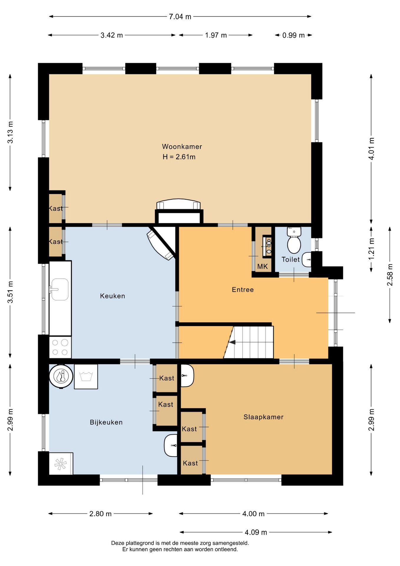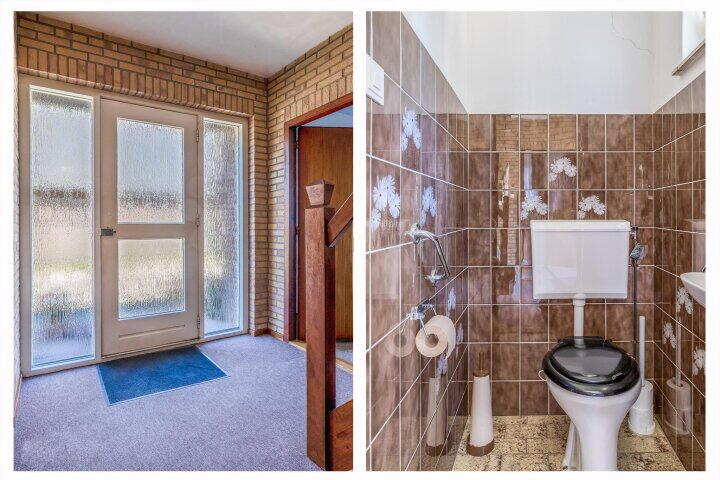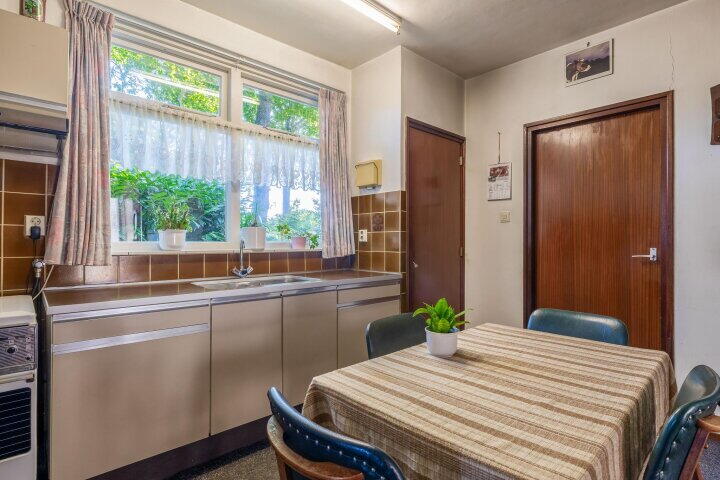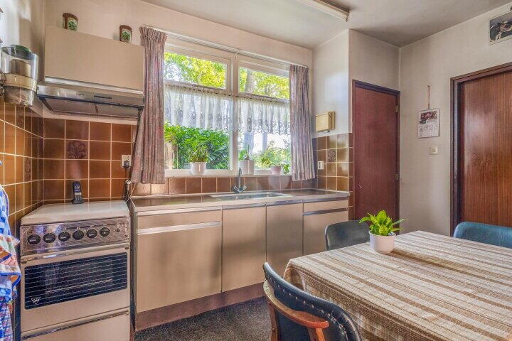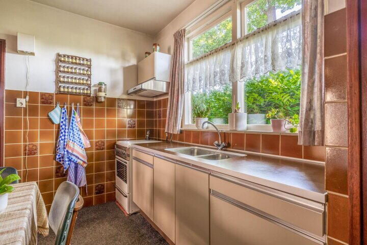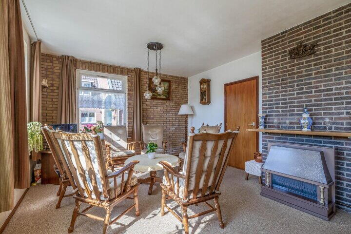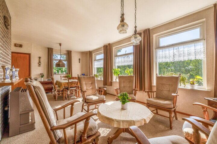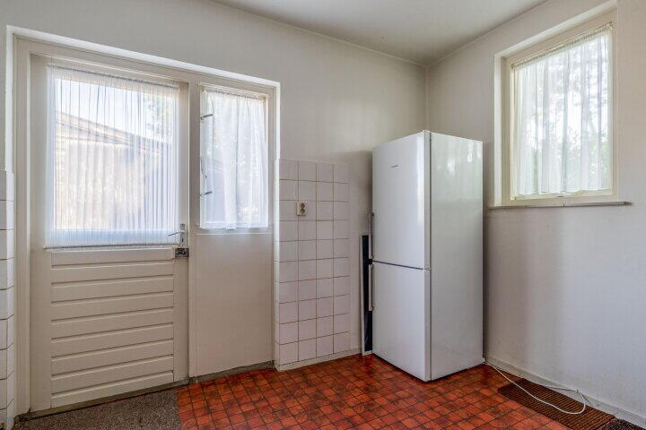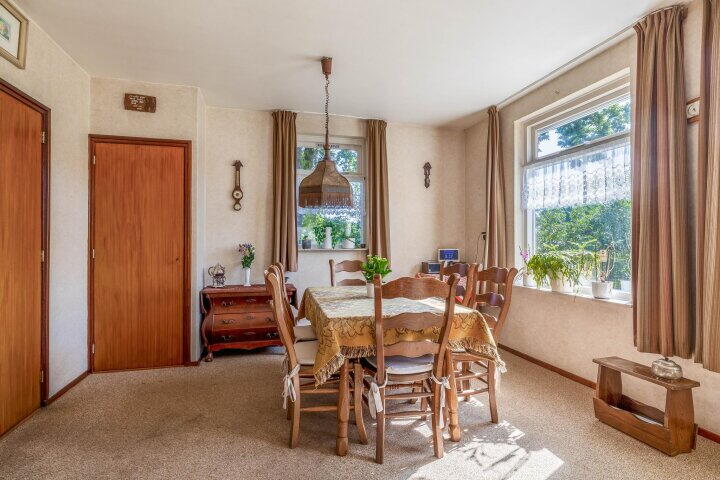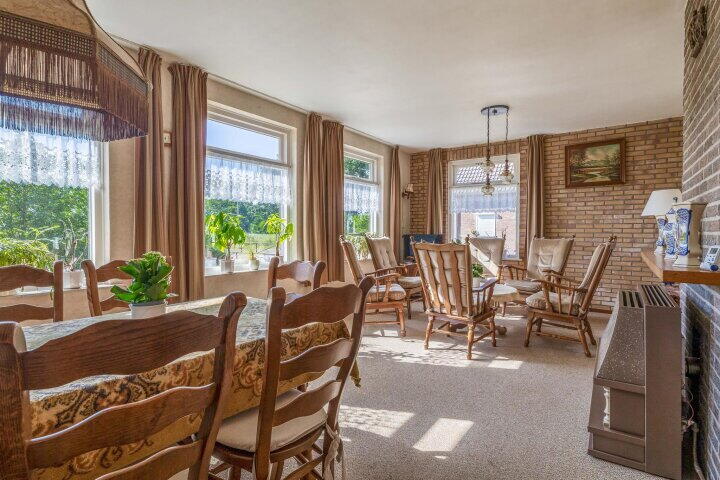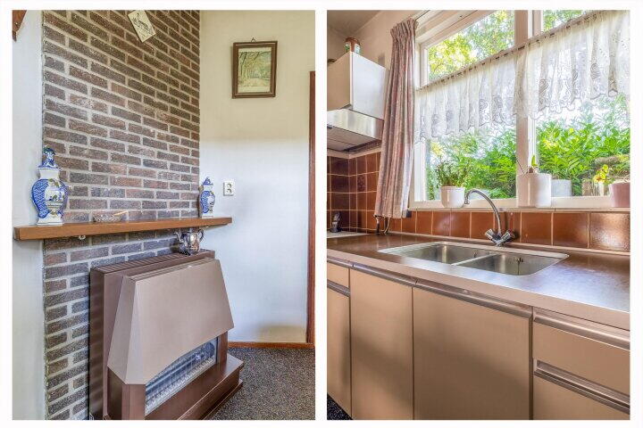 Je komt binnen in de lichte, ruime hal met trapopgang (voorzien van traplift), net toilet met fonteintje en meterkast. Vanuit de hal heb je toegang tot de slaapkamer, woonkamer en keuken. De slaapkamer is lekker ruim met draai-kiep raam aan achterzijde, 2 vaste kasten en een vaste wastafel. De woonkamer is aan de voorzijde en heeft een fijne lichtinval door de 5 ramen. Van hieruit kijk je vrij over de landerijen naar de Drentse Hoofdvaart. Verder zijn hier een gaskachel en een vaste kast. Aansluitend is de gesloten (woon)keuken die dus bereikbaar is vanuit zowel de woonkamer als de hal. Ook hier vind je een gaskachel en vaste kast. Het keukenblok is klein en eenvoudig met een los fornuis ernaast. Boven het aanrecht met dubbele wasbak zit een dubbel raam waardoor je goed licht hebt op het werkblad en uitzicht op de zijtuin. Verder is er nog een kelder voor extra voorraadopslag. Vanuit de keuken kun je naar de riante en praktische bijkeuken met witgoedaansluiting, boiler opstelling, raam en deur naar buiten naar de achterzijde van de woning. Verder vind je hier ook weer 2 vaste kasten en een wastafel. Tezamen met de vaste kasten en wastafel in de slaapkamer, aan de andere kant van de muur, is hier een prima mogelijkheid en ruimte voor een badkamer.
