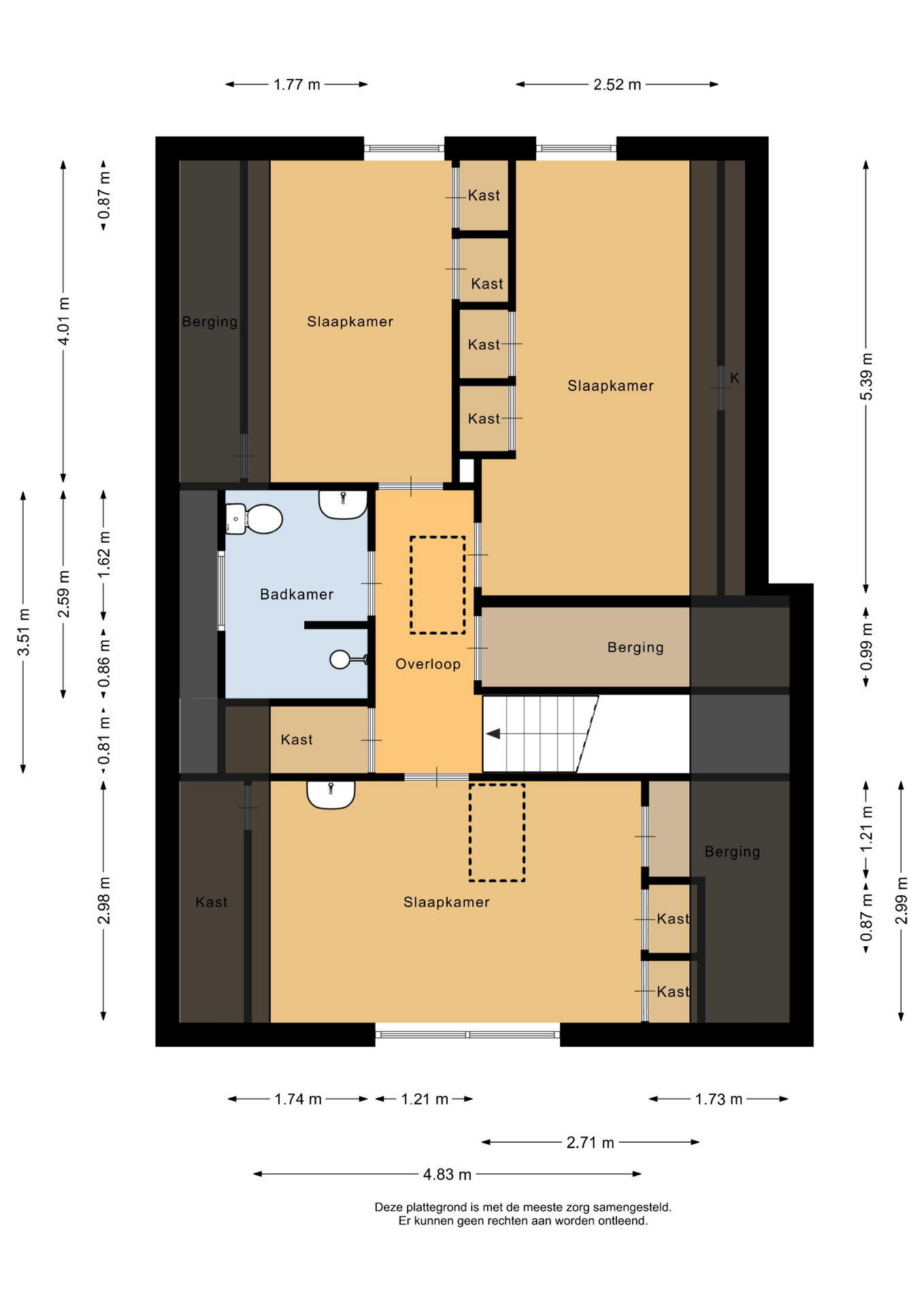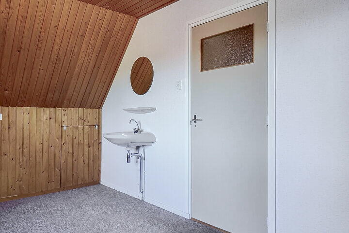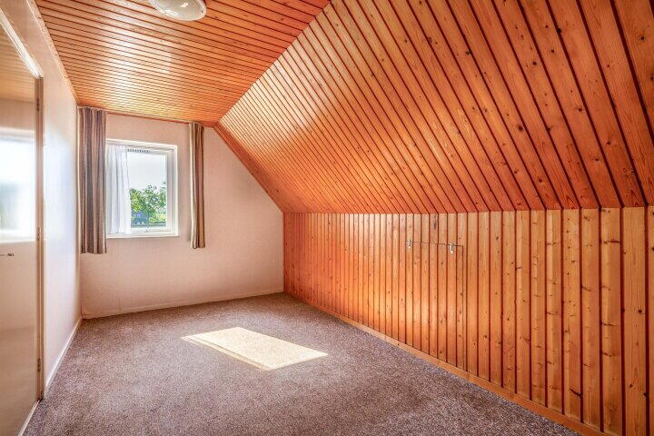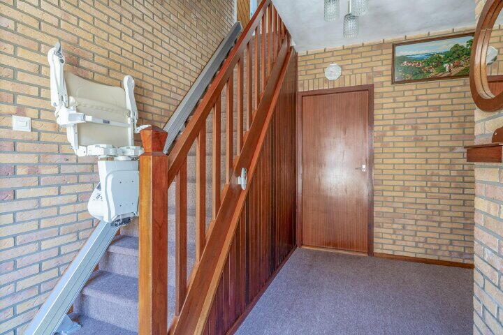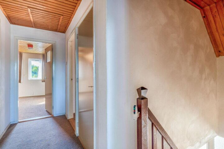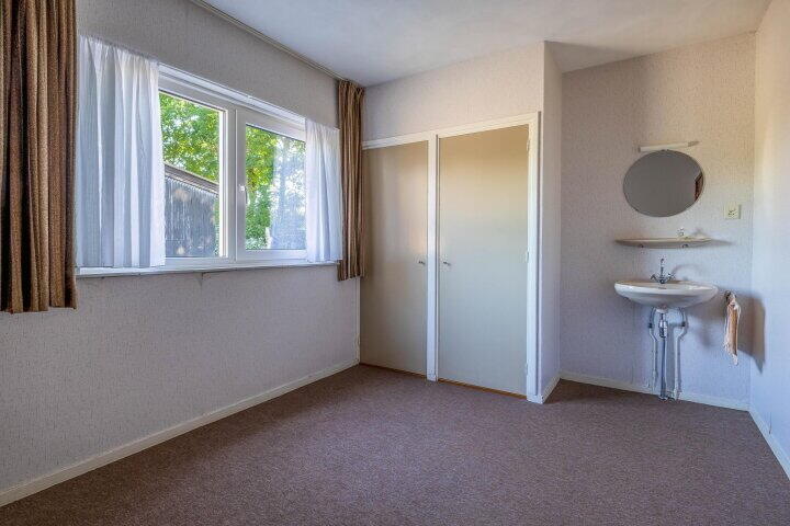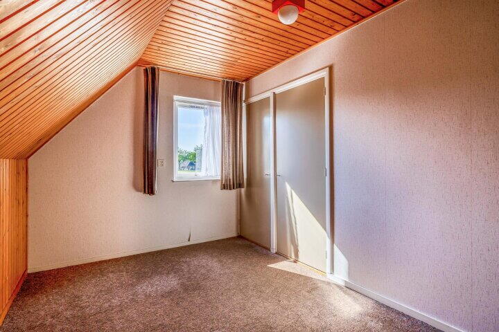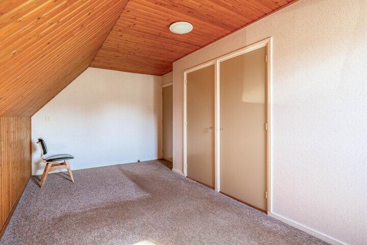 De rechte trap met traplift brengt je naar de verdieping waar je vanaf de overloop toegang hebt tot 3 slaapkamers, een vaste inbouwkast, berging en de badkamer. De grootste slaapkamer is over de gehele breedte aan de achterzijde van de woning en is voorzien van een dubbel raam, vaste wastafel, 2 vaste inbouwkasten en een vaste inloopkast. Achter de schuine wand is bergruimte bereikbaar via een luik. Ook de andere 2 slaapkamers hebben 2 vaste inbouwkasten en bergruimte achter de schuine wanden. De gedateerde maar nette badkamer is voorzien van een vaste wastafel, toilet en een inloopdouche. Het raam zorgt voor natuurlijk lichtinval en ventilatie. Door de dakkapel zijn hier geen schuine wanden.